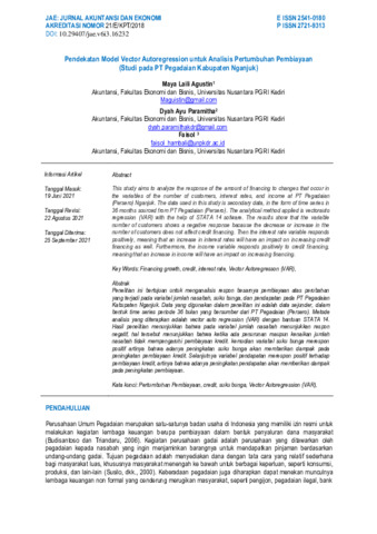 Maya Laili, Agustin and Dyah Ayu, Paramitha and Faisol, Faisol (2021) Pendekatan model vector autoregression untuk analisis pertumbuhan pembiayaan: studi pada PT Pegadaian Kabupaten Nganjuk. JAE (Jurnal Akuntansi dan Ekonomi), 6 (3): 2. pp. 10-18. ISSN 2721-9313