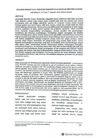 Telah dilakukan analisis resiko dengan teknik HAZOPS pada salah satu instalasi pada industri perminyakan yaitu unit distilasi atmosferik. Instalasi ini mengubah minyak mentah menjadi beberapa produk awal seperti bensin, nafta berat, kerosin, minyak gas, minyak diesel dan residu melalui beberapa sistem proses. Sistem proses yang terlibat antara lain pemanasan di dalam tungku pemanas, pemisahan di dalam menara pemisah dan pemisahan uap-fluida. Teknik HAZOPS secara sistematis mengidentifikasi penyimpangan, mencari penyebab dari penyimpangan, konsekuensi dari timbulnya penyimpangan, kemungkinan langkah pencegahan dan tindakan berupa perubahan desain. Kajian terhadap sistem proses unit distilasi atmosferik hanya berdasarkan diagram skematik yang tidak sepenuhnya akurat dengan beberapa asumsi parameter operasi. Studi unit distalasi menghasilkan beberapa komponen penting antara lain tungku pemanas, menara pemisah, tangki stripper, akumulato dan pompa-pompa yang menjadi objek analisis. Secara hipotesis penyimpangan-penyimpangan yang dapat teridentifikasi antara lain berhubungan dengan tidak adanya aliran, bertambahnya tekanan, berkurangnya tekanan, berkurangnya ketinggian, bertambahnya temperatur dan terjadinya korosi lebih awal. Hasil analisis terhadap penyebab, dan konsekuensi yang berhubungan dengan penyimpangan di atas mengarah pada beberapa langkah pencegahan dan tindakan yang dapat direkomendasikan walaupun bersifat subjektif. Secara umum hasil analisis mengarah pada peningkatan keselamatan instalasi dari resiko kebakaran, ledakan dan kegagalan akibat korosi yang didukung oleh perbaikan manajemen perawatan dan perubahan manajemen operasi.