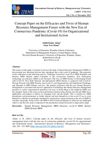 Abdul Kahar Adam and Isaac Yaw Manu (2021) Concept paper on the efficacies and twist of human resource management future with the new era of Coronavirus pandemic (covid-19) for organizational and institutional action. International Journal of Business, Management and Economics, 2 (4). pp. 228-321. ISSN 2746-1351