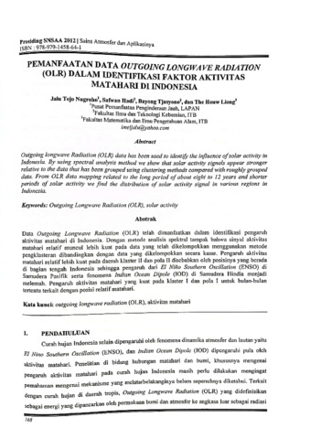 Data Outgoing Longwave Radiation (OLR) telah dimanfaatkan dalam identifikasi pengaruh aktivitas matahari di Indonesia. Dengan metode analisis spektral tampak bahwa sinyal aktivitas matahari relatif muncul lebih kuat pada data yang telah dikelompokkan menggunakan metode pengklasteran dibandingkan dengan data yang dikelompokkan secara kasarPengaruh aktivitas matahari relatif lebih kuat pada daerah klaster II dan pola II disebabkan oleh posisinya yang berada. di bagian tengah Indonesia sehingga pengaruh dari El Niño Southern Oscillation (ENSO) di Samudera Pasifik serta fenomena Indian Ocean Dipole (IOD) di Samudera Hindia menjadi melemah. Pengaruh aktivitas matahari yang kuat pada klaster I dan pola I untuk bulan-bulan tertentu terkait dengan posisi relatif matahari.