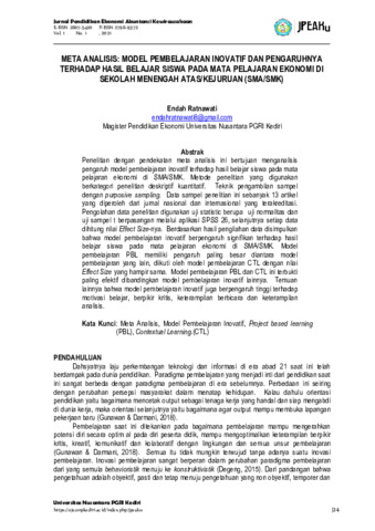Penelitian dengan pendekatan meta analisis ini bertujuan menganalisis pengaruh model pembelajaran inovatif terhadap hasil belajar siswa pada mata pelajaran ekonomi di SMA/SMK. Metode penelitian yang digunakan berkategori penelitian deskriptif kuantitatif. Teknik pengambilan sampel dengan purposive sampling. Data sampel penelitian ini sebanyak 13 artikel yang diperoleh dari jurnal nasional dan internasional yang terakreditasi. Pengolahan data penelitian digunakan uji statistic berupa uji normalitas dan uji sampel t berpasangan melalui aplikasi SPSS 26, selanjutnya setiap data dihitung nilai Effect Size-nya. Berdasarkan hasil pengilahan data disimpulkan bahwa model pembelajaran inovatif berpengaruh signifikan terhadap hasil belajar siswa pada mata pelajaran ekonomi di SMA/SMK. Model pembelajaran PBL memiliki pengaruh paling besar diantara model pembelajaran yang lain, diikuti oleh model pembelajaran CTL dengan nilai Effect Size yang hampir sama. Model pembelajaran PBL dan CTL ini terbukti paling efektif dibandingkan model pembelajaran inovatif lainnya. Temuan lainnya bahwa model pembelajaran inovatif juga berpengaruh tinggi terhadap motivasi belajar, berpikir kritis, keterampilan berbicara dan keterampilan analisis.