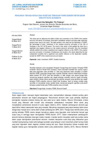 Anisah Citra Rakhadita and P.S. Prabowo (2022) Pengaruh tenaga kerja dan investasi terhadap PDRB subsektor ekonomi kreatif Kota Surabaya. JAE (Jurnal Akuntansi dan Ekonomi), 7 (1): 4. pp. 30-41. ISSN 2721-9313