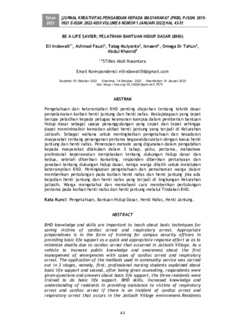 Eli Indawati and Achmad Fauzi and Tatag Mulyanto and Isnaeni and Omega Dr Tahun and Abdul Khamid (2023) Be a life savier; pelatihan bantuan hidup dasar (BHD). Jurnal Kreativitas Pengabdian kepada Masyarakat, 6 (1): 4. pp. 43-51. ISSN 2615-0921