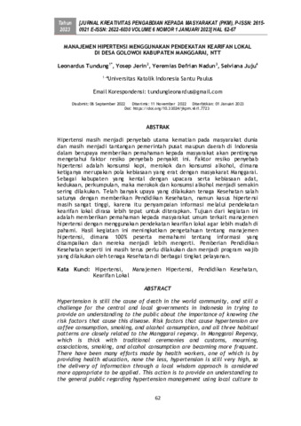 Leonardus Tundung and Yosep Jerin and Yeremias Defrian Nadun and Selviana Juju (2023) Manajemen hipertensi menggunakan pendekatan kearifan lokal di Desa Golowoi Kabupaten Manggarai, NTT. Jurnal Kreativitas Pengabdian kepada Masyarakat, 6 (1): 6. pp. 62-67. ISSN 2615-0921