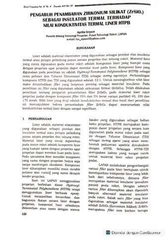 Aprilia Erryani (2011) Pengaruh penambahan Zirkonium silikat (ZrSiO4) sebagai insulator termal terhadap nilai konduktivitas termal liner HTPB. Berita Dirgantara Majalah Ilmiah Semi Populer, 12 (4): 2. pp. 126-131. ISSN 1411-8920