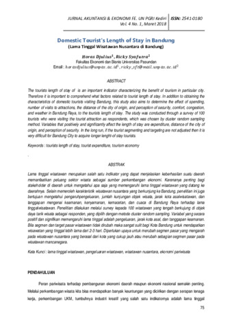 Horas Djulius and Ricky Syafutra (2019) Lama tinggal wisatawan nusantara di Bandung. JAE (Jurnal Akuntansi dan Ekonomi), 4 (1): 6. pp. 75-86. ISSN 2721-9313