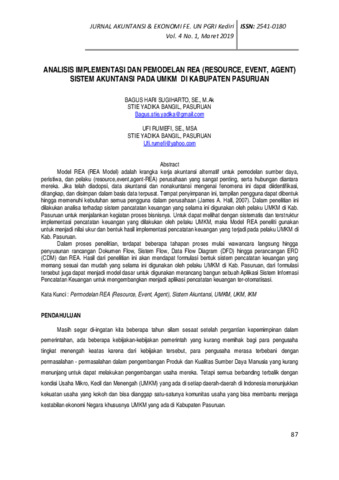 Ufi, Rumefi (2019) Analisis implementasi dan pemodelan REA (Resource, Event, Agent) sistem akuntansi pada UMKM di Kabupaten Pasuruan. JAE (Jurnal Akuntansi dan Ekonomi), 4 (1): 7. pp. 87-103. ISSN 2721-9313