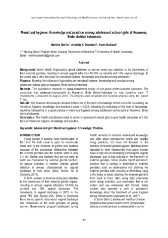 Martina, Bedho and Anatolia K., Doondori and Irwan, Budiana (2022) Menstrual hygiene : Knowledge and practice among adolescent school girls at Koawena, Ende district-Indonesia. Malahayati International Journal of Nursing and Health Science, 3 (1): 3. pp. 22-28. ISSN 2620-9152