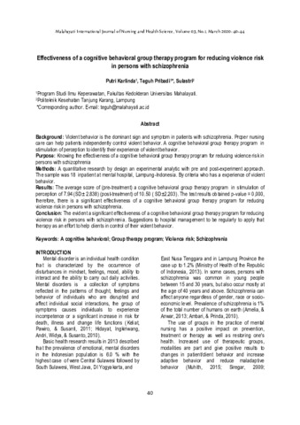Putri Karlinda and Teguh Pribadi and Sulastri (2020) Effectiveness of a cognitive behavioral group therapy program for reducing violence risk in persons with schizophrenia. Malahayati International Journal of Nursing and Health Science, 3 (1): 6. pp. 40-44. ISSN 2620-9152