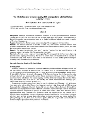 Masroni and Ni Made Manik Elisa Putri and Anita Dwi Ariyani (2020) The effect of exercise to improve quality of life among patients with heart failure: a literature review. Malahayati International Journal of Nursing and Health Science, 3 (1): 7. pp. 45-56. ISSN 2620-9152