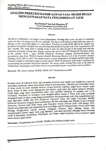 Kejadian banjir di Indonesia bukan lagi merupakan fenomena baruBanjir yang terjadi bukan hanya di pemukiman penduduk, namun juga banyak terjadi di area pesawahanDampak yang ditimbulkan banjir di lahan sawah ini dapat merusak tanaman hingga berakibat terjadinya gagal tanam ataupun gagal panen. Banjir di lahan sawah dipengaruhi oleh kondisi curah hujan dan tingkat kehijauan tanaman. Curah hujan yang dapat menyebabkan banjir yaitu melebihi kebutuhan air tanaman padi (>150 mm/bulan)Penelitian ini bertujuan untuk mengidentifikasi daerah di Pulau Jawa yang seringkali mengalami banjir di lahan sawah dengan pemanfaatan data penginderaan jauhData penginderaan jauh yang digunakan adalah data EVI (Enhanced Vegetation Index) dari satelit Terra/Aqua MODIS (Moderate Resolution Imaging Spectroradiometer) dan data curah hujan dari TRMM (Tropical Rainfall Measuring Mission) pada bulan basah yaitu Desember Januari Februari (DJF) 2006 hingga 2012. Metode yang digunakan yaitu interpolasi linier curah hujan dan EVI delapan harianPotensi curah hujan dihitung menggunakan metode skoringSedangkan frekuensi banjir dihitung dengan cara mengakumulasi potensi banjir berat yang diperoleh. Dari hasil penelitian diketahui bahwa beberapa sawah di Kabupaten Tasikmalaya, Majalengka, dan Ciamis sangat berpotensi sering mengalami gagal tanam maupun gagal panen.