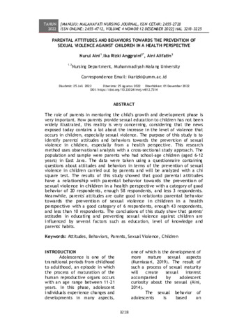 Nurul Aini and Ika Rizki Anggraini and Aini Alifatin (2022) Parental attitudes and behaviors towards the prevention of sexual violence against children in a health perspective. MANUJU: Malahayati Nursing Journal, 4 (12): 4. pp. 3218-3225. ISSN 2655-2728