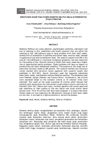 Iwan Shalahuddin and Aliya Rahayu and Bambang Aditya Nugraha (2022) Kebutuhan dasar pada pasien diabetes melitus melalui pendekatan studi literatur. MANUJU: Malahayati Nursing Journal, 4 (12): 5. pp. 3226-3242. ISSN 2655-2728
