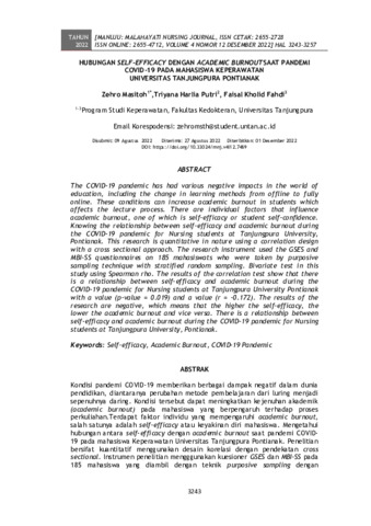 Zehro Masitoh and Triyana Harlia Putri and Faisal Kholid Fahdi (2022) Hubungan self-efficacy dengan academic burn-out saat pandemi COVID-19 pada mahasiswa keperawatan Universitas Tanjungpura Pontianak. MANUJU: Malahayati Nursing Journal, 4 (12): 6. pp. 3243-3257. ISSN 2655-2728