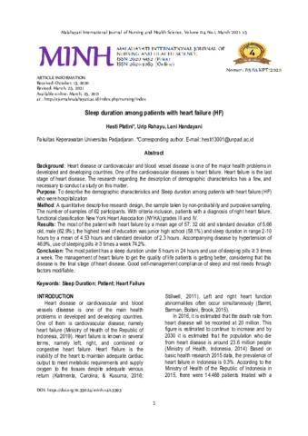 Hesti Platini and Urip Rahayu and Leni Handayani (2021) Sleep duration among patients with heart failure (HF). Malahayati International Journal of Nursing and Health Science, 4 (1): 1. pp. 1-5. ISSN 2620-9152