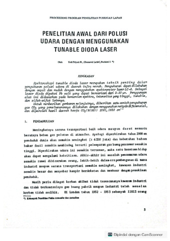 Spektroskopi tunable dioda laser merupakan teknik penting dalam pengukuran polusi udara di daerah infra merah. Pengukuran dapat dilakukan dengan cepat dan mudah dengan menggunakan spektrometer laser LS-3. Sebagai laser dioda dipakai Pb salt yang dapat bervariasi dari 3-30 um. Penggunaan alat ini didasarkan pada kemurnian spektra, intensitas yang tinggi, tunable, dan sifat-sifat lainnya. Untuk memberikan gambaran selanjutnya, diberikan satu contoh pengukuran gas CO2 yang penelusuranya dilakukan dengan menggunakan metode diferensial, dan diperoleh hasil daerah kerja CO2 (R(30)) 1281, 1650 cm-1