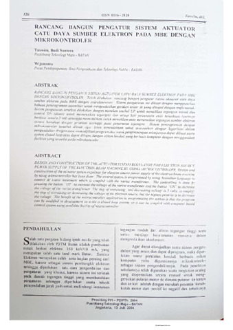 Telah dilakukan rancang bangun pengatur sistem aktuator catu daya sumber elektron pada MBE dengan mikrokontroler. Sistem pengaturan ini dibuat dengan menggunakan bahasa pemrograman assembler untuk mengendalikan gerakan motor dc yang dikopel dengan trafo variak. Sistem pengaturan tersebut dilakukan dengan menekan tombol UP untuk menaikkan tegangan variak dan tombol DN (down) untuk menurunkan tegangan dan setiap kali penurunan atau kenaikkan (perstep) berkisar antara 5 volt sehingga memudahkan untuk menaikkan atau menurunkan tegangan sumber elektron secara bertahap dengan prioritas tertinggi pada penurunan tegangan. Sistem pemrograman dengan mikrokontroler tersebut dibuat agar lebih memudahkan untuk disesuaikan dengan keperluan dalam pengendalian dengan cara memodifikasi program dan untuk pengembangan selanjutnya dapat dibuat suatu system closed loop atau dapat dikopel dengan sistem kendali yang berbasis komputer dengan menggunakan fasilitas yang tersedia pada mikrokontroler.
