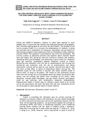 Yogik Setia Anggreini and Y. Kambu and Ivony Fn Putriningtyas (2023) SMS Ceria Program (senam mata sehat cerdas kombinasi relaksasi) for overcoming computer vision syndrome (CVS) in Elementary School student. Jurnal Kreativitas Pengabdian kepada Masyarakat, 6 (2): 9. 505 -516. ISSN 2615-0921