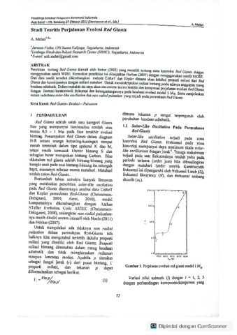 Penelitian tentang Red Giants diawali oleh Retter (2003) yang meneliti tentang zona konveksi Red Giants dengan menggunakan satelit WIRE. Kemudian penelitian ini dilanjutkan Barban (2007) dengan mengggunakan satelit MOST. Dari data satelit tersebut dikembangkan metode CoRoT dan Kepler dimana akan ketahui properti osilasi dari Red Giants dan kemiripannya dengan osilasi matahari. Untuk mendiskripsikan osilasi bintang perlu adanya anggapan ruang keadaan adiabatik. Dalam makalah ini saya akan me-review secara teoritis dan komputasi perjalanan evolusi Red Giants dengan ilustrasi karakteristik frekuensi dan ketergantungannya pada keadaan evolusi model 1 M@. Serta menjelaskan secara sederhana solar-like oscillation dan non radial pulsation yang terjadi pada permukaan Red Giants.