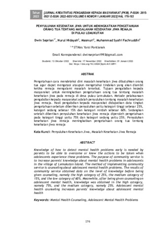 Dwin Seprian and Nurul Hidayah and Masmuri and Muhammad Syafri Fachruddin (2023) Penyuluhan kesehatan jiwa untuk meningkatkan pengetahuan orang tua tentang masalahan kesehatan jiwa remaja di pulau lemukutan. Jurnal Kreativitas Pengabdian kepada Masyarakat, 6 (1): 17. pp. 176-183. ISSN 2615-0921