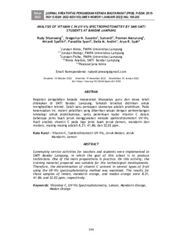 Rudy Situmeang and Gregorius N. Susanto and Sumardi and Posman Manurung and Miranti Syafitri and Faradilla Syani and Della M. Andini and Arya R. Syah (2023) Analysis of vitamin c in uv-vis spectrophotometry by SMK-SMTI students at Bandar Lampung. Jurnal Kreativitas Pengabdian kepada Masyarakat, 6 (1): 19. pp. 194-202. ISSN 2615-0921