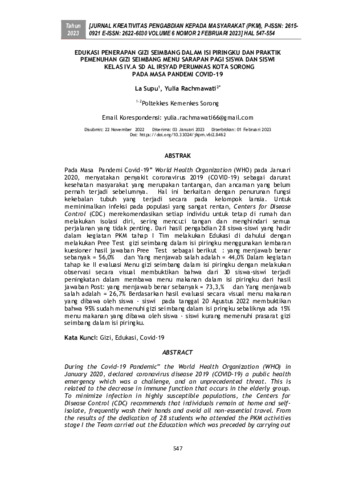 La Supu and Yulia Rachmawati (2023) Edukasi penerapan gizi seimbang dalam isi piringku dan praktik pemenuhan gizi seimbang menu sarapan pagi siswa dan siswi kelas IV.A SD Al Irsyad Perumnas Kota Sorong pada masa pandemi Covid-19. Jurnal Kreativitas Pengabdian kepada Masyarakat, 6 (2): 13. pp. 547-554. ISSN 2615-0921