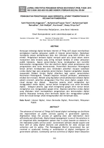 Santi Rukminita Anggraeni and Muhammad Fauzan Tamir and Muhammad Sajid Ramadhan and Nursiswati and Deasy Silvya Sar (2023) Peningkatan pengetahuan aman berdigital aparat pemerintahan di Kecamatan Pamengpeuk. Jurnal Kreativitas Pengabdian kepada Masyarakat, 6 (2): 14. pp. 555-564. ISSN 2615-0921