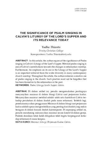 Yudha, Thianto (2021) The significance of psalm singing in Calvin's liturgy of the lord's supper and Its relevance today. Verbum Christi: Jurnal Teologi Reformed Injili, 8 (2): 2. pp. 149-162. ISSN 2355-6374