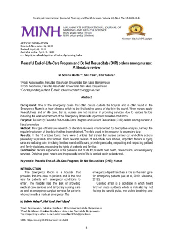 M. Sobirin, Mohtar and Silvi, Yanti and Fitri, Yuliana (2022) Peaceful End-of-Life-Care Program and Do Not Resuscitate (DNR) orders among nurses: a literature review. Malahayati International Journal of Nursing and Health Science, 5 (1): 2. pp. 8-16. ISSN 2620-9152
