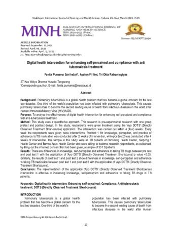 Fenita Purnama Sari, Indah and Ayatun Fil, Ilmi and Tri Okta, Ratnaningtyas (2022) Digital health intervention for enhancing self-perceived and compliance with anti tuberculosis treatment. Malahayati International Journal of Nursing and Health Science, 5 (1): 3. pp. 17-23. ISSN 2620-9152