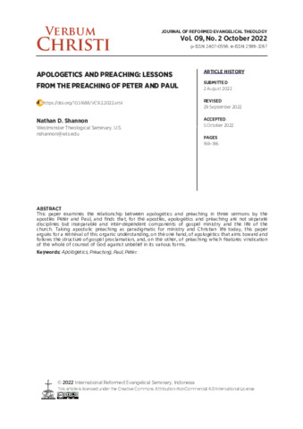 Nathan D. Shannon (2022) Apologetics and preaching: lessons from the preaching of Peter and Paul. Verbum Christi: Jurnal Teologi Reformed Injili, 9 (2): 4. pp. 169-186. ISSN 2355-6374
