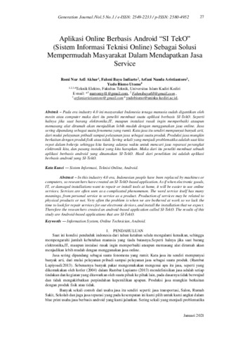 Romi, Nur Asfi Akbar and Fahmi, Bayu Indiarto and Arfani, Nanda Aristiantoro and Yudo, Bismo Utomo (2021) Aplikasi online berbasis android “SI TekO” (Sistem Informasi Teknisi Online) Sebagai solusi mempermudah masyarakat dalam mendapatkan jasa service. Generation Journal, 5 (1): 4. pp. 27-34. ISSN 2580-4952