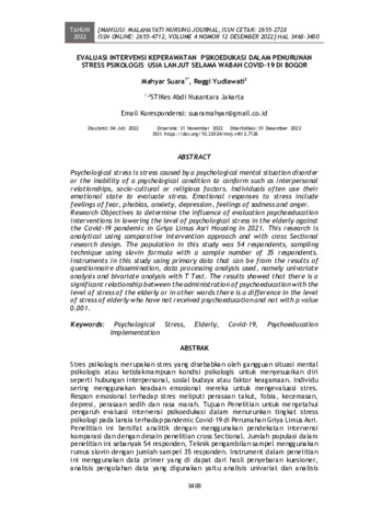 Mahyar, Suara and Reggi, Yudiawati (2022) Evaluasi intervensi keperawatan psikoedukasi dalam penurunan stress psikologis usia lanjut selama wabah Covid-19 di Bogor. MANUJU: MALAHAYATI NURSING JOURNAL, 4 (12): 25. pp. 3468-3480. ISSN 2655-2728