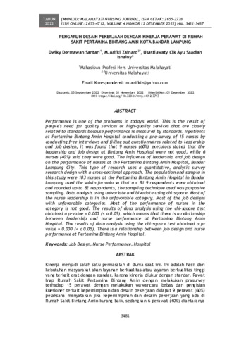 Dwiky Dermawan, Santari and M.Arifki, Zainaro and Usastiawaty Cik Ayu Saadiah, Isnainy (2022) Pengaruh desain pekerjaan dengan kinerja perawat di Rumah Sakit Pertamina Bintang Amin Kota Bandar Lampung. MANUJU: MALAHAYATI NURSING JOURNAL, 4 (12): 26. pp. 3481-3487. ISSN 2655-2728