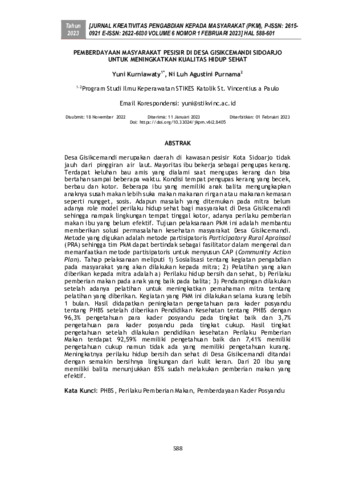 Desa Gisikcemandi merupakan daerah di kawasan pesisir Kota Sidoarjo tidak jauh dari pinggiran air laut. Mayoritas ibu bekerja sebagai pengupas kerang. Terdapat keluhan bau amis yang dialami saat mengupas kerang dan bisa bertahan sampai beberapa waktu. Kondisi tempat pengupas kerang yang becek, berbau dan kotor. Beberapa ibu yang memiliki anak balita mengungkapkan anaknya susah makan lebih suka makan makanan ringan atau makanan kemasan seperti nungget, sosis. Adapun masalah yang ditemukan pada mitra belum adanya role model perilaku hidup sehat bagi masyarakat di Desa Gisikcemandi sehingga nampak lingkungan tempat tinggal kotor, adanya perilaku pemberian makan ibu yang belum efektif. Tujuan pelaksanaan PkM ini adalah membantu memberikan solusi permasalahan kesehatan masyarakat Desa Gisikcemandi. Metode yang digukan adalah metode partisipatoris Participatory Rural Apraissal (PRA) sehingga tim PkM dapat bertindak sebagai fasilitator dalam mengenal dan memanfaatkan metode partisipatoris untuk menyusun CAP (Community Action Plan). Tahap pelaksanaan meliputi 1) Sosialisasi tentang kegiatan pengabdian pada masyarakat yang akan dilakukan kepada mitra; 2) Pelatihan yang akan diberikan kepada mitra adalah a) Perilaku hidup bersih dan sehat, b) Perilaku pemberian makan pada anak yang baik pada balita; 3) Pendampingan dilakukan setelah adanya pelatihan untuk meningkatkan pemahaman mitra tentang pelatihan yang diberikan. Kegiatan yang PkM ini dilakukan selama kurang lebih 1 bulan. Hasil didapatkan peningkatan pengetahuan para kader posyandu tentang PHBS setelah diberikan Pendidikan Kesehatan tentang PHBS dengan 96,3% pengetahuan para kader posyandu pada tingkat baik dan 3,7% pengetahuan para kader posyandu pada tingkat cukup. Hasil tingkat pengetahuan setelah dilakukan pendidikan kesehatan Perilaku Pemberian Makan terdapat 92,59% memiliki pengetahuan baik dan 7,41% memiliki pengetahuan cukup namun tidak ada yang memiliki pengetahuan kurang. Meningkatnya perilaku hidup bersih dan sehat di Desa Gisikcemandi ditandai dengan semakin bersihnya lingkungan dari kulit keran. Dari 20 ibu yang memiliki balita menunjukkan 85% sudah melakukan pemberian makan yang efektif.