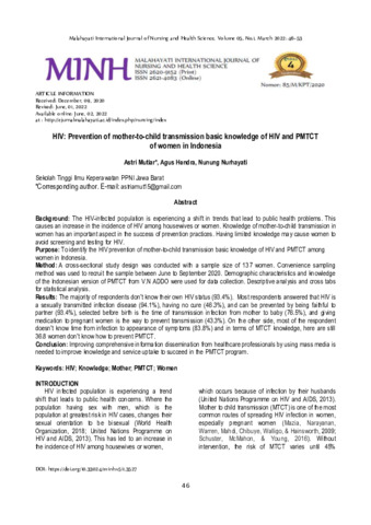 Astri, Mutiar and Agus, Hendra and Nunung, Nurhayati (2022) HIV: Prevention of mother-to-child transmission basic knowledge of HIV and PMTCT of women in Indonesia. Malahayati International Journal of Nursing and Health Science, 5 (1): 7. pp. 46-53. ISSN 2620-9152