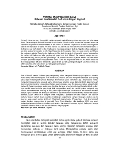 Nikmatus Sa’adah and Mahayatma Soendoro and Ida Wahyuningsih and Thoifur Mashudi (2020) Potential of hidrogen (pH) saliva sebelum dan sesudah berkumur dengan yoghurt. Jurnal Nusantara Medika, 4 (1): 5. pp. 42-46. ISSN 2963-3311