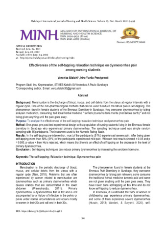 Veronica Silalahi and Irine Yunila Prastyawati (2022) Effectiveness of the self-tapping relaxation technique on dysmenorrhea pain among nursing students. Malahayati International Journal of Nursing and Health Science, 5 (1): 8. pp. 54-59. ISSN 2620-9152