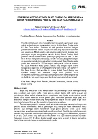 Rada, Ayuningtyas and Sri, Kantun and Tiara, Tiara (2022) Penerapan metode Activity Based Costing dalam penentuan harga pokok produksi pada CV Biru Daun Kabupaten Jember. Jurnal Pendidikan Ekonomi Akuntansi Kewirausahaan, 2 (1). pp. 17-23. ISSN 2807-5420