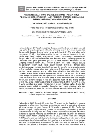 Lisa Yuliana Sari and Andoko and Aryanti Wardiyah (2023) Teknik relaksasi nafas dalam dan kompres hangat untuk penurunan intensitas nyeri pada penderita gastritis di Desa Bumi Sari Kecamatan Natar Lampung Selatan. Jurnal Kreativitas Pengabdian kepada Masyarakat, 6 (2): 21. pp. 633-639. ISSN 2615-0921