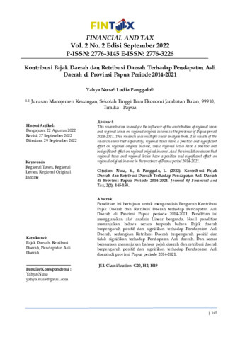 Yahya, Nusa and Ludia, Panggalo (2022) Kontribusi pajak daerah dan retribusi daerah terhadap pendapatan asli daerah di Provinsi Papua periode 2014-2021. Journal of Financial and Tax, 2 (2): 5. pp. 145-155. ISSN 2776-3145