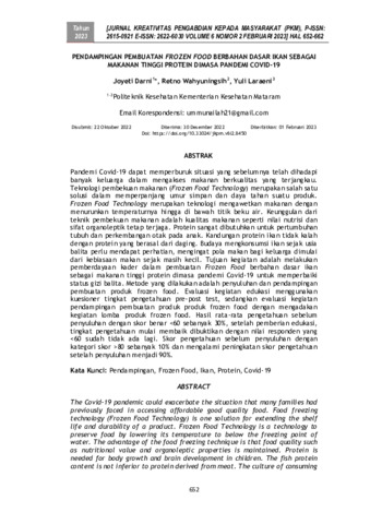 Joyeti Darni and Retno Wahyuningsih and Yuli Laraeni (2023) Pendampingan pembuatan frozen food berbahan dasar ikan sebagai makanan tinggi protein dimasa pandemi covid-19. Jurnal Kreativitas Pengabdian kepada Masyarakat, 6 (2): 24. pp. 652-662. ISSN 2615-0921