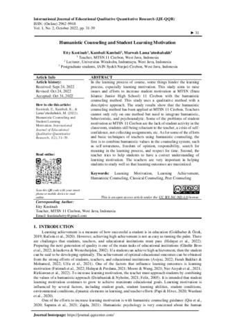 Etty, Kustinah and Kambali, Kambali and Marwah, Lama’atushabakh (2022) Humanistic counseling and student learning motivation. International Journal of Educational Qualitative Quantitative Research (IJE-QQR), 1 (2): 5. pp. 31-39. ISSN 2962-9918