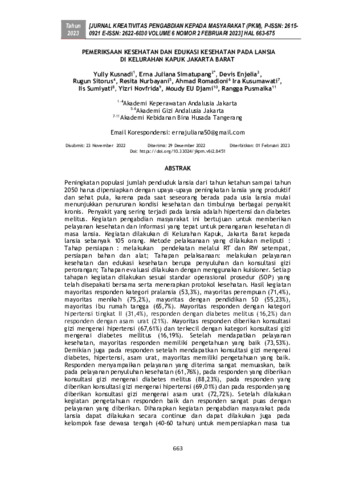 Yully Kusnadi and Erna Juliana Simatupang and Devis Enjelia and Rugun Sitorus and Resita Nurbayani and Ahmad Romadloni and Ira Kusumawati and Iis Sumiyati and Yizsri Novfrida and Moudy EU Djami and Rangga Pusmaika (2023) Pemeriksaan kesehatan dan edukasi kesehatan pada lansia di Kelurahan Kapuk Jakarta Barat. Jurnal Kreativitas Pengabdian kepada Masyarakat, 6 (2): 25. pp. 663-675. ISSN 2615-0921