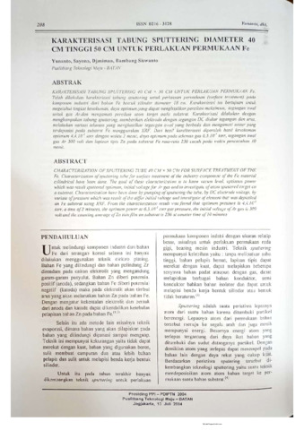 Telah dilakukan karakterisasi tabung sputtering untuk perlakuan permukaan (surface treatment) pada komponen industri dari bahan Fe bentuk silinder diameter 18 cm. Karakterisasi ini bertujuan untuk megetahui tingkat kevakuman, daya optimum yang dapat menghasilkan percikan maksimum, tegangan awal untuk gas Ar dan mengamati percikan atom target pada substrat. Karakterisasi dilakukan dengan menghampakan tabung sputtering, memberikan elektroda dengan tegangan DC diukur tegangan dan arus, melakukan variasi tekanan yang menghasilkan tegangan awal yang berbeda dan mengamati unsur yang terdeposisi pada substrat Fe menggunakan XRF. Dari hasil karakterisasi diperoleh hasil kevakuman optimum 4.4.10 minus 1 torr dengan waktu 2 menit, daya optimum pada tekanan gas 6.5.10 minus satu torr, tegangan awal gas Ar 300 volt dan lapisan tipis Zn pada substrat Fe rata-rata 236 cacah pada waktu pencacahan 10 menit.