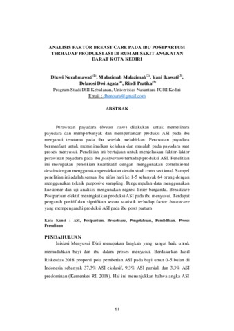 Perawatan payudara (breast care) dilakukan untuk memelihara payudara dan memperbanyak dan memperlancar produksi ASI pada ibu menyusui terutama pada ibu setelah melahirkan. Perawatan payudara bermanfaat untuk meminimalkan keluhan dan masalah pada payudara saat proses menyusui. Penelitian ini bertujuan untuk menjelaskan faktor-faktor perawatan payudara pada ibu postpartum terhadap produksi ASI. Penelitian ini merupakan penelitian kuantitatif dengan menggunakan correlational desain dengan menggunakan pendekatan desain studi cross sectional. Sampel penelitian ini adalah semua ibu nifas hari ke 1-5 sebanyak 64 orang dengan menggunakan teknik purposive sampling. Pengumpulan data menggunakan kuesioner dan uji analisis mengunakan regresi linier berganda. Breastcare Postpartum efektif meningkatkan produksi ASI pada ibu menyusui. Terdapat pengaruh positif dan signifikan secara statistik terhadap factor breastcare yang mempengaruhi produksi ASI pada ibu postt partum.