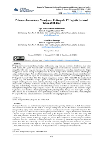 Alya, Fellayati Putri Darmawan and Aries, Heru Prasetyo (2022) Pedoman dan asesmen manajemen risiko pada PT Logistik Nasional tahun 2022-2023. Journal of Emerging Business Management and Entrepreneurship Studies, 2 (2): 6. pp. 176-195. ISSN 2797-3115