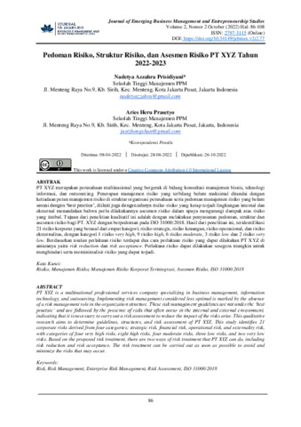 Nadetya, Azzahra Prisidiyani and Aries, Heru Prasetyo (2022) Pedoman risiko, struktur risiko, dan asesmen risiko PT XYZ tahun 2022-2023. Journal of Emerging Business Management and Entrepreneurship Studies, 2 (2): 1. pp. 86-108. ISSN 2797-3115