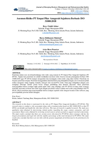 Rexy, Chalid Akbar and Haryo, Ridhonoto Muktiati and Aries, Heru Prasetyo (2022) Asesmen risiko PT Empat Pilar Anugerah Sejahtera berbasis ISO 31000:2018. Journal of Emerging Business Management and Entrepreneurship Studies, 2 (1): 3. pp. 128-145. ISSN 2797-3115