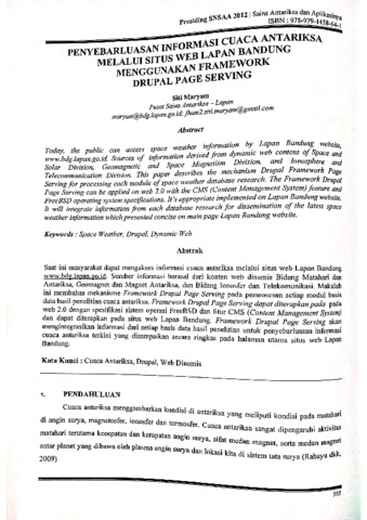 Saat ini masyarakat dapat mengakses informasi cuaca antariksa melalui situs web Lapan Bandung www.bdg.lapan.go.id. Sumber informasi berasal dari konten web dinamis Bidang Matahari dan Antariksa, Geomagnet dan Magnet Antariksa, dan Bidang lonosfer dan Telekomunikasi. Makalah ini membahas mekanisme Framework Drupal Page Serving pada pemrosesan setiap modul basis data hasil penelitian cuaca antariksa. Framework Drupal Page Serving dapat diterapkan pada pada web 2.0 dengan spesifikasi sistem operasi FreeBSD dan fitur CMS (Content Management System) dan dapat diterapkan pada situs web Lapan Bandung. Framework Drupal Page Serving akan mengintegrasikan informasi dari setiap basis data hasil penelitian untuk penyebarluasan informasi cuaca antariksa terkini yang disampaikan secara ringkas pada halaman utama situs web Lapan Bandung.